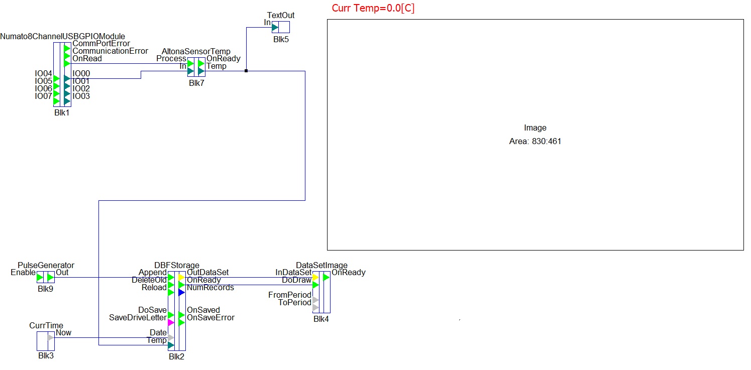 The DBFStorage block has an input Append, which is connected to the output of the block PulseGenerator, which gets a pulse on every one second. This means, DBFStorage block will add a new record with measured values to the DBF database on every one second. Every time, a new record is added, the output OnReady of the block becomes for a short time to a high level and signals the next block DataSetImage to draw the new contains of the database.
