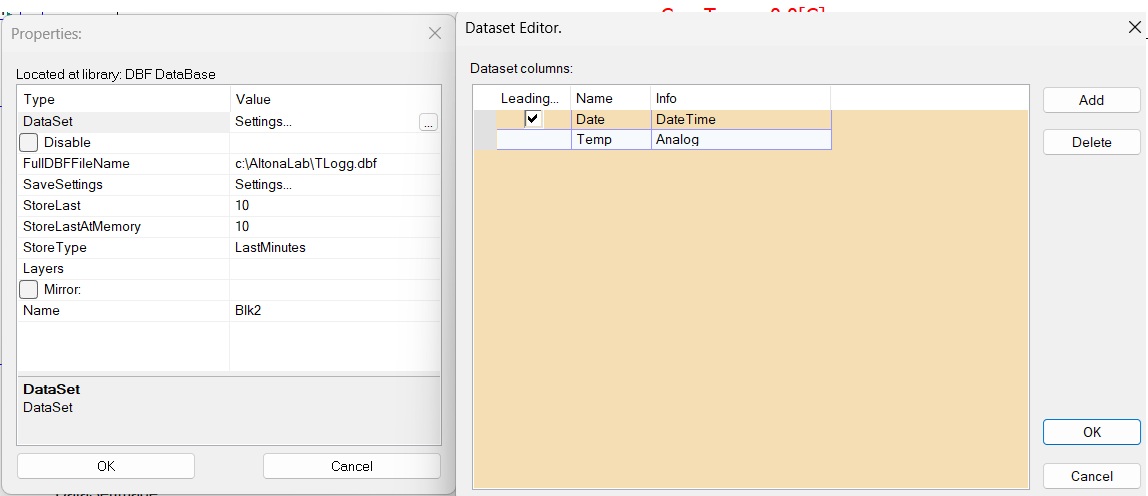 – DataSet – this is a very important parameter, which describes the design of the database. At our case, the database has two columns – Date, which has to be checked as Leading date column and is with Date data type and column Temp – with Analog data type. We can add unlimited amount of columns. When we confirm this parameter, the DBF database will be redesigned with all the needful changes. At our case, the DBF database will consists of two columns: Date, Temp and one index over the leading Date column. All the columns will appear as inputs of the block, as it is visible from the diagram, the block DBFStorage contains the inputs Date, Temp. The input Date is connected with CurrTime block, from where the current time will be gotten.