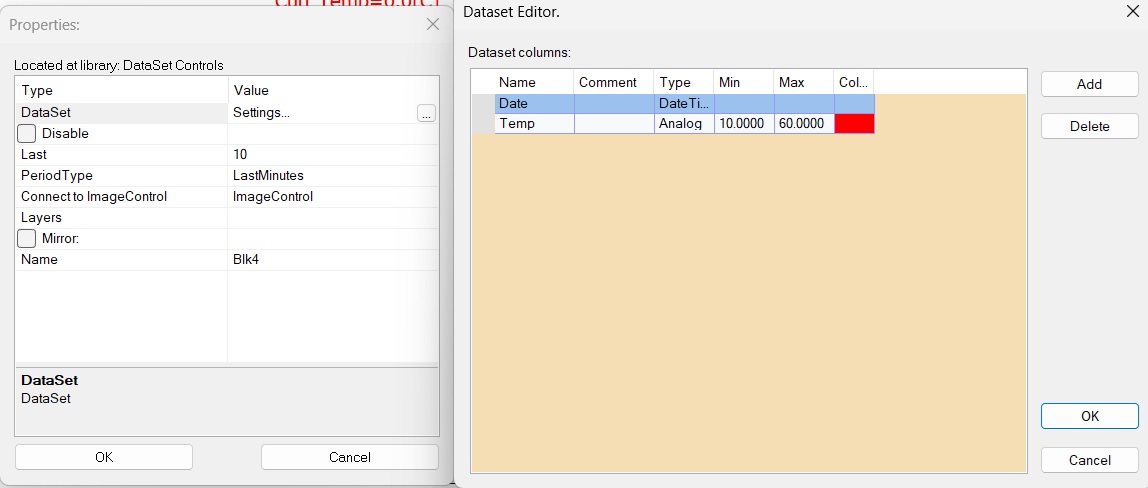 – DataSet – with this most important parameter we can design which columns from the input dataset InDataSet of the block to be shown on the Image control, theirs Min/Max values and dot’s colors. In our case, the columns are Date with Date data type and Temp with Analog data type. The column Temp is set to be shown in range 10…60 in Red color. Date column is from a leading column with Date data type and is used for X axis of the image. The trick here is – at this parameter can be described more or less column than into the input DataSet, which is gotten from DBFStorage, but the block DataSetImage will show only the data, if the column described in DataSetImage exists into the input InDataSet gotten from the previous block.