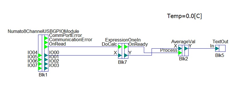 The output OnRead of the Numato block is connected with the input DoCalc of ExpressionUni block. This is because, when the Numato block read the data from the analog inputs, its output OnRead becomes for a short time to a high level and this signals the block ExpressionUni to start the calculations. When the calculations are done, the output OnReady of the block ExpressionUni becomes to a high level and signals the next blocks AverageVal to start theirs calculations too.