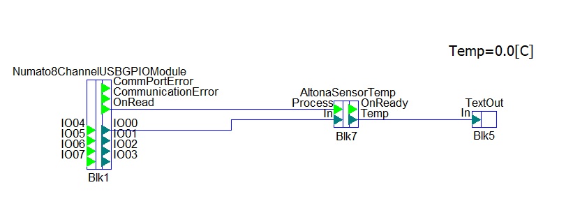 The output OnRead of the Numato block is connected with Process input of AltonaSensorTemp block and when the data is read from Numato block, it signals the next block to start its calculations.