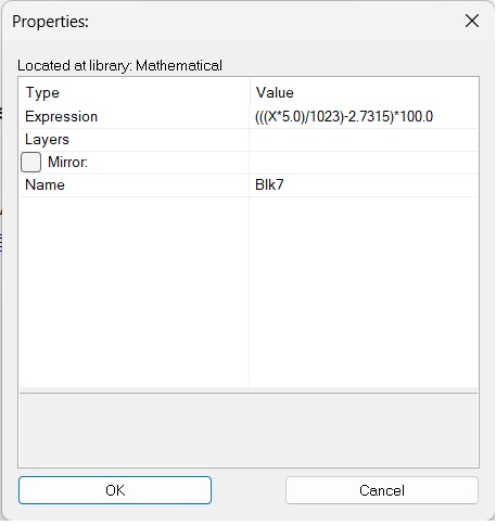 Please note, Input parameter from the expressions above, where is explained how to convert ADC value to temperature is replaced with X, because X is name of the input of ExpressionOneIn functional block. The interface with parameters of ExpressionOneIn is shown below: